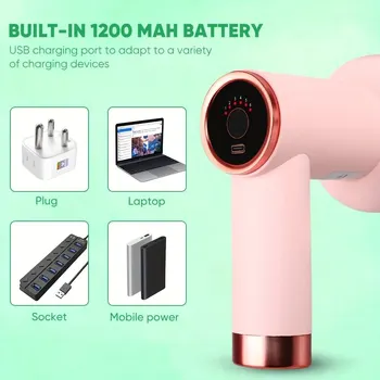 Rechargeable mini massage gun with 6-speed settings and 5 interchangeable heads for fat reduction, body shaping, and muscle relaxation therapy.