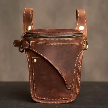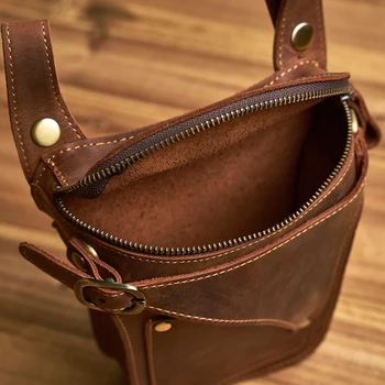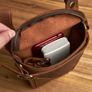 Retro-style genuine leather men’s waist bag with dedicated 6.5-inch phone slot, multifunctional storage for keys, wallet, and sports essentials.