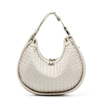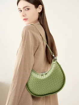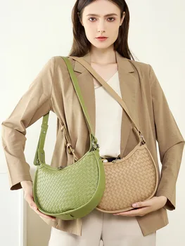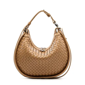 Second-layer cowhide leather handbag with woven craftsmanship, designed as a versatile armpit-to-shoulder crescent bag. Stylish and durable for daily wear.