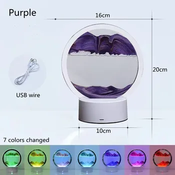 Dynamic RGB quicksand LED lamp with 7-color 3D sand effects. USB-powered 5V night light for bedroom decor, bedside ambiance, or as a unique hourglass-inspired gift.